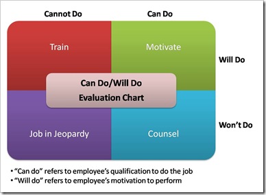 | Here “Can do” refers to employee’s qualification to do the job and “Will do” refers to employee’s motivation to perform. The results are four alternatives: - Can Do/Will Do - Ideal Situation. The employee is fully qualified and doing the job as desired. The Manager should motivate and incentivize the employee suitably.